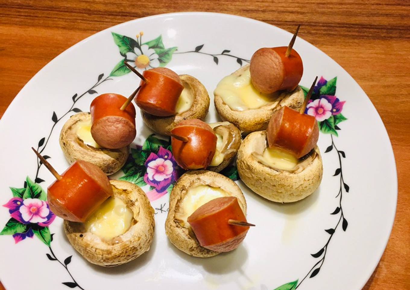 - Rellenar cada champiñón con queso, y posteriormente montar sobre ellos, con un mondadientes, un trozo de salchicha cortada en monedas.