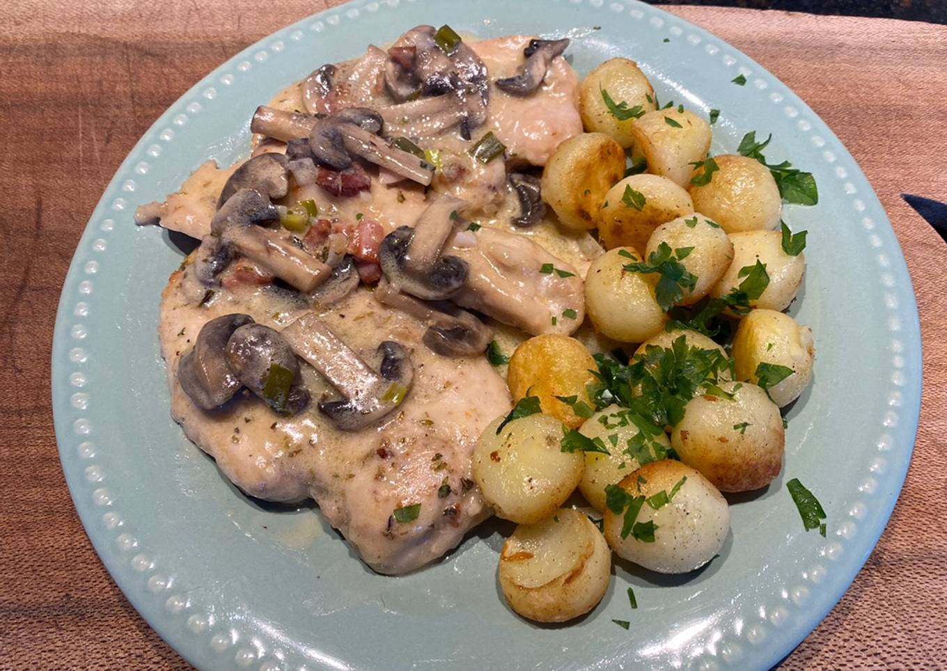 Escalopes de pollo con crema de champiñones y verdeo con papas noisettes