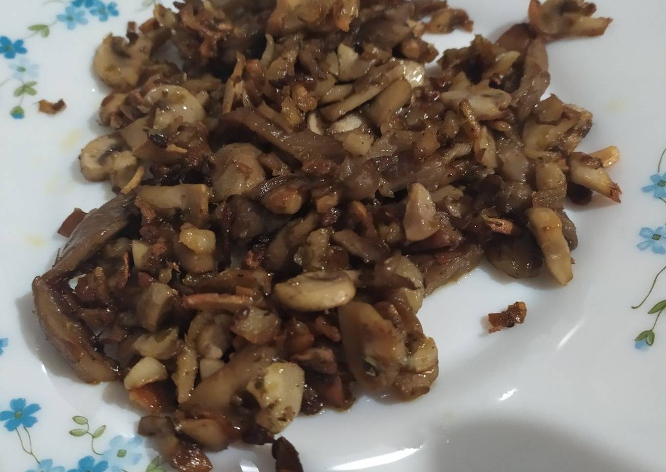 - Cuando los tengamos troceados, ponemos la sartén a calentar. Una vez que los trozos más pequeños de ajo se empiecen a dorar, echamos las setas y los champiñones y un chorrito más de aceite. Echamos la sal y el orégano.